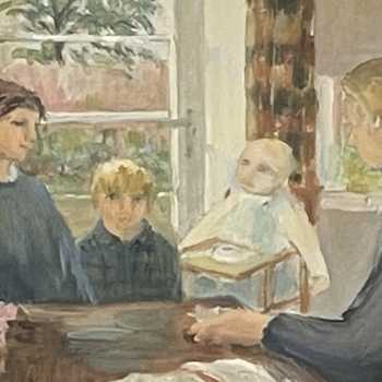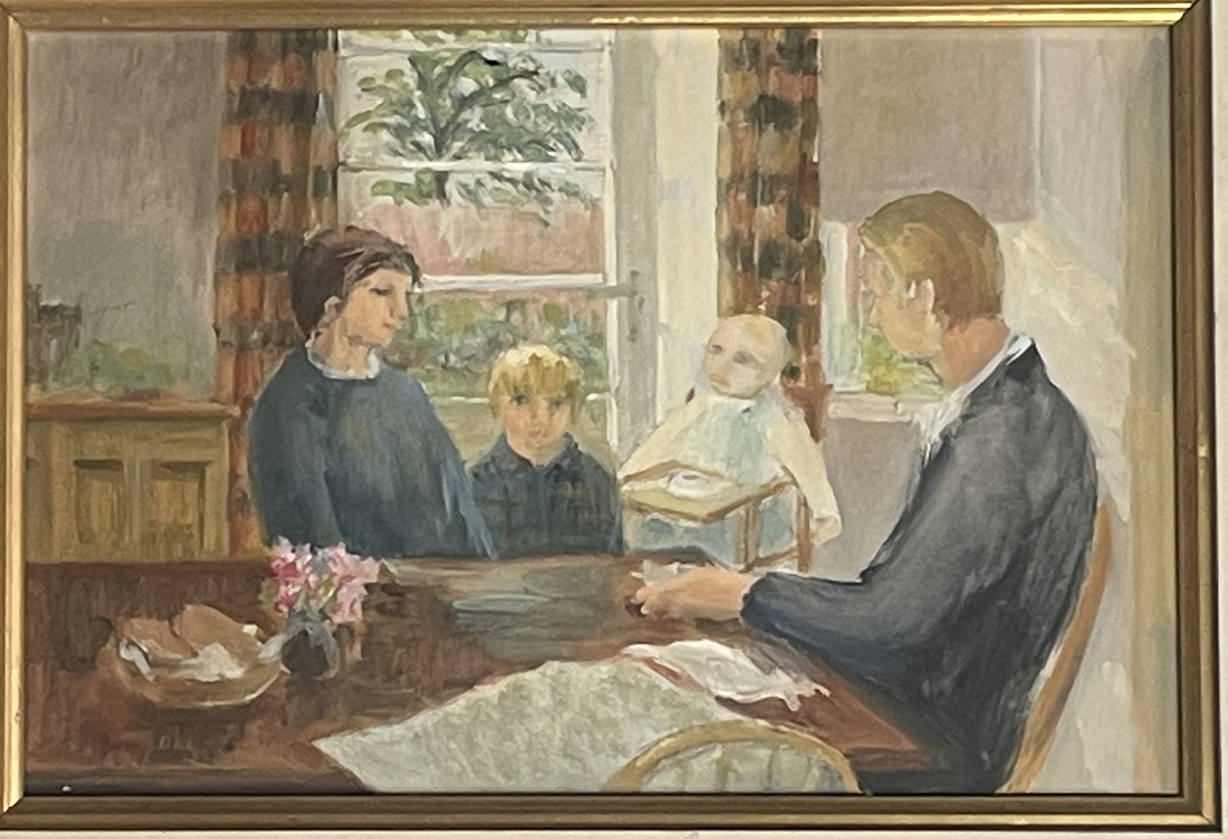 Helmut Petzsch A Family Gathering Oil on Board Frame: 12” x 16” Image: 8” x 12” Provenance: Collection of the family. Helmut Petzsch (1920 - 2008) was a painter in oil and watercolour, of landscapes, urban scenes and figure subjects. He came from Germany to England in 1932, and later studied at the Edinburgh College of Art under William Gillies. He exhibited at the Royal Scottish Academy and with the Society of Scottish Artists.