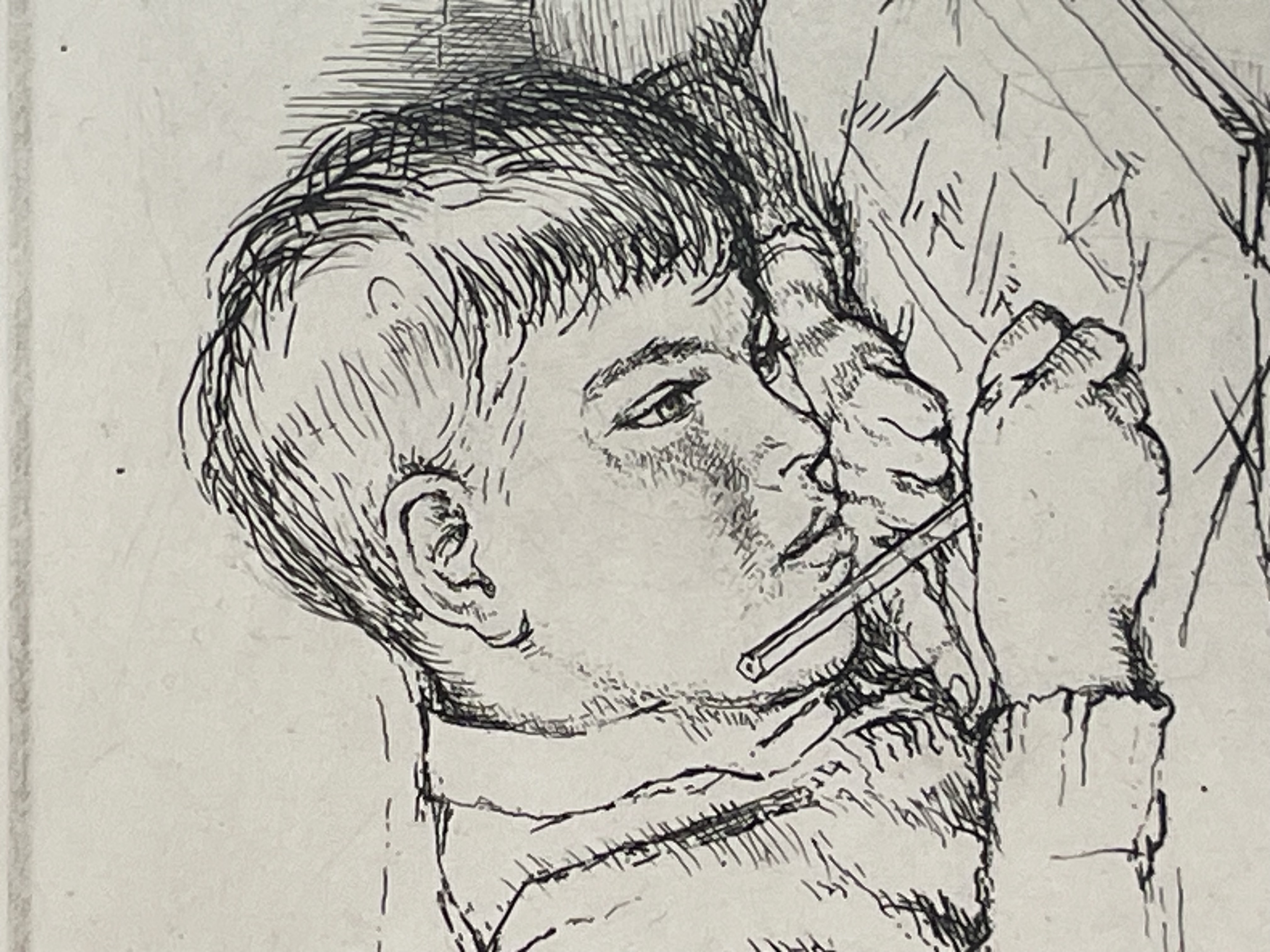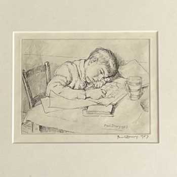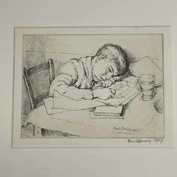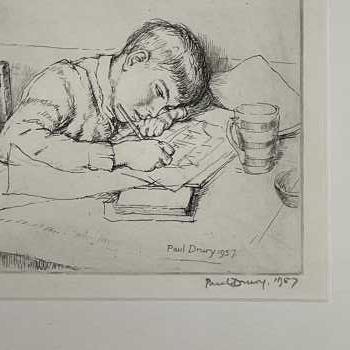 Boy Working 1957 Paul Drury (1903 - 1987) Etching Frame: 15” x 17” Image: 6” x 7.5” Paul Drury was born in London and studied at Goldsmiths College. He made some ninety-two prints of which about half were portraits and a quarter landscapes. He later taught at Goldsmiths, becoming principal, and was President of the Royal Society of Painter-Etchers.